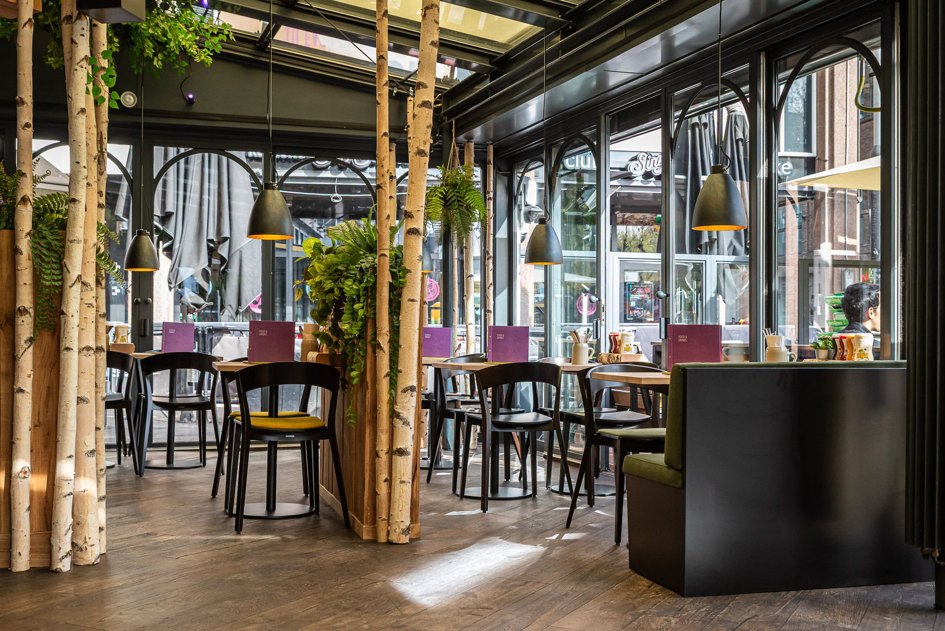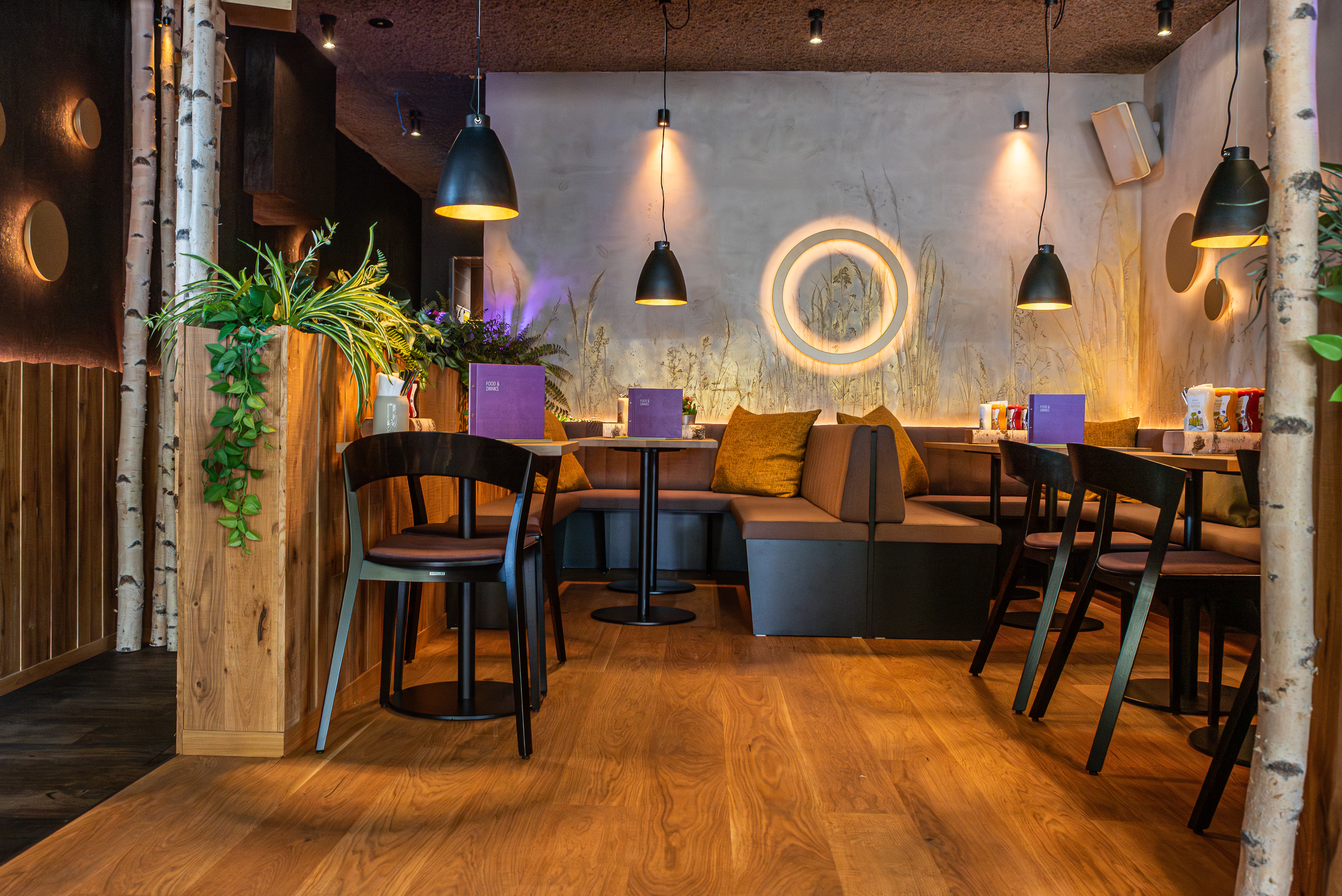 Welcome to our birch forest in Amsterdam. Enjoy incomparable culinary moments of happiness with your loved ones in a casual atmosphere. At Hans im Glück, you will always find a large selection of fresh food and drinks from tasty burgers to crisp salads and delicious snacks. A diverse range of vegetarian and vegan options awaits you at our restaurant in Amsterdam – but meat lovers won’t miss out either. There is simply something for everyone here! And if it just needs to be something chilled and uplifting – you will find a great choice of delicious cocktails at our cosy bar.